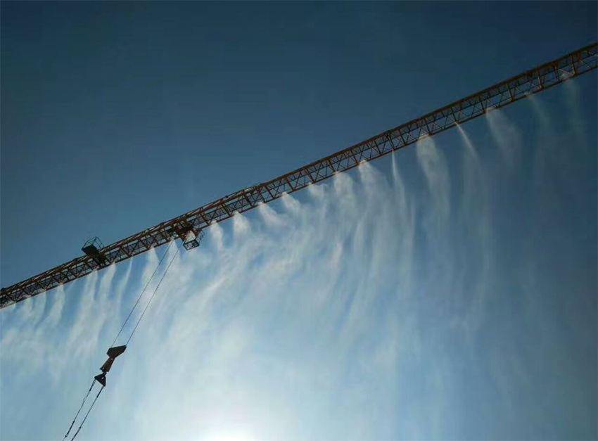 塔吊橫臂始終在工地的至高點,噴水系統在塔吊的旋轉范圍內進行全方位、零死角霧狀噴水,水通過噴嘴射出飄飛的水霧,可有效吸附空中的灰塵顆粒和雜質,可以控制工地揚塵不往外擴散,起到降塵的作用,同時在高空噴淋一段時間后,地面將形成一片濕潤狀態,能有效的壓制住灰塵重新揚起。