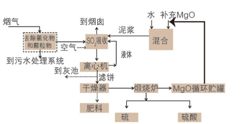 濕法氧化鎂工藝主要由煙氣系統、漿液制備系統、洗滌及吸收系統、脫水及干燥系統等組成。裝置副產品的亞硫酸鎂在硫酸廠焙燒后生成氧化鎂返回脫硫裝置。