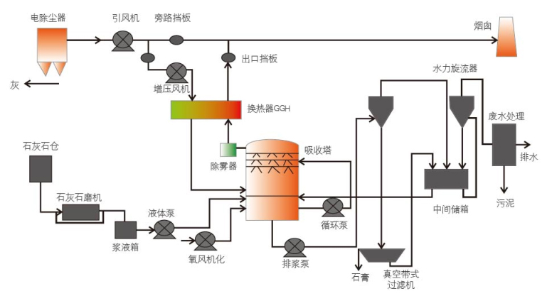鍋爐引風機出來的煙氣進行換熱降溫,降溫后的煙氣進入吸收塔下部。吸收塔中的吸收劑石灰石漿液由塔的上部向下噴淋與向上流動的煙氣逆流混合,煙氣中的二氧化硫(SO2)與吸收漿液反應生成亞硫酸鈣同時進一步被鼓入的空氣中的氧氣(O2)氧化成硫酸鈣( CaSO4·2H2O)即石膏;脫硫后的潔凈飽和煙氣依次經過除霧器除去霧滴,由脫硫風機經煙窗排入大氣。